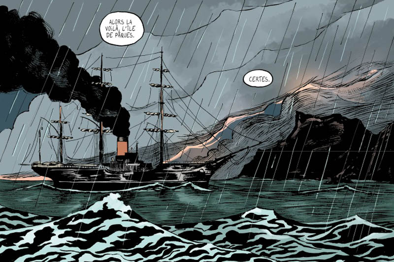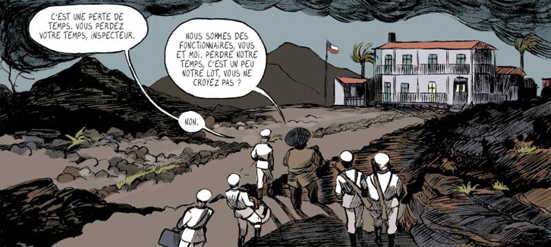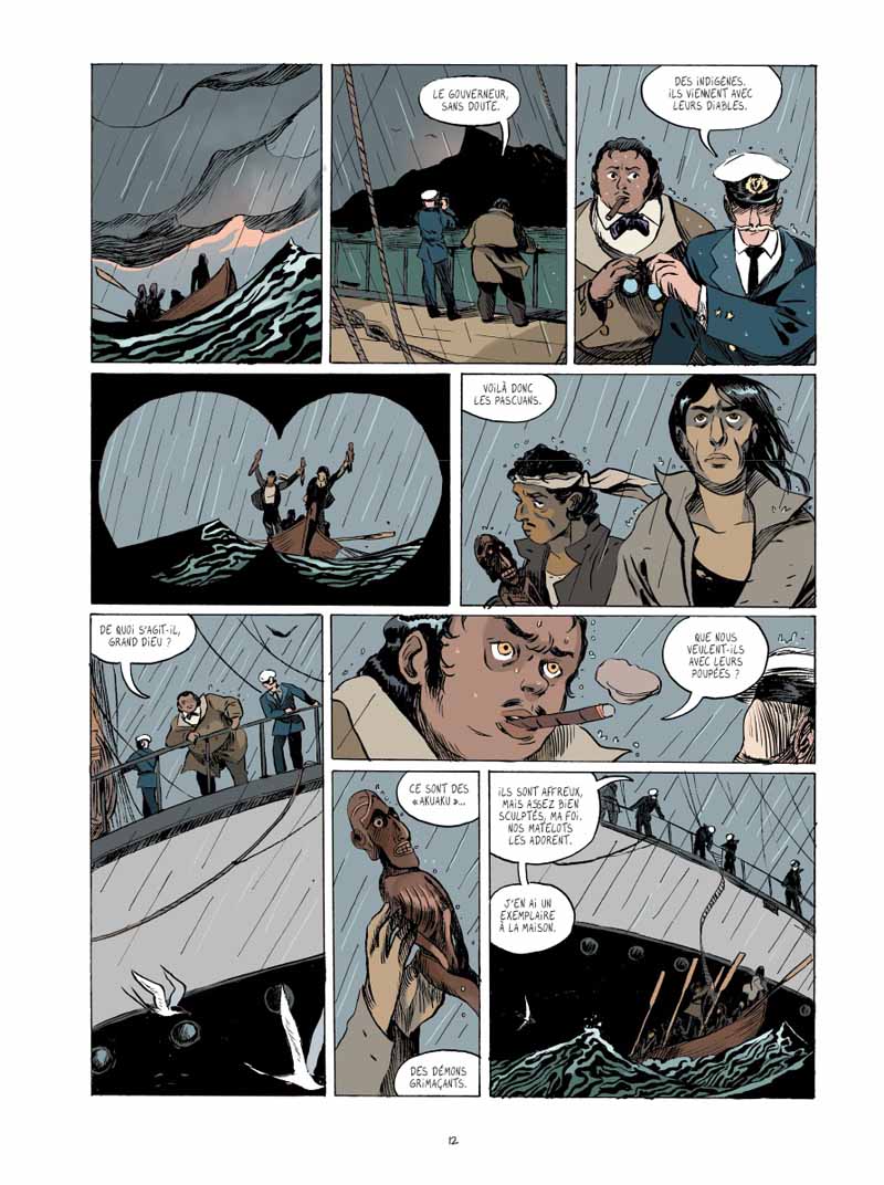 Pour concevoir son scénario, Thomas Lavachery s’est inspiré du témoignage de son grand-père, qui avait séjourné sur l’île en 1934 lors d’une mission archéologique, comme il l’évoque en post-face. Celui-ci s’était dit hanté à jamais par le fait divers évoqué dans le livre (dont je ne peux rien dire au risque de gâcher la surprise du dénouement). C’est ainsi que l’on découvre une communauté autochtone sous la domination des colonisateurs. Les Pascuans (gentilé des habitants) sont exploités pour les tâches subalternes, relégués dans des habitations de fortune. Et lorsqu’ils sont contaminés par la lèpre qui à cette époque faisait des ravages dans les pays tropicaux, ils sont confinés et entassés dans une léproserie qui n’est rien d’autre qu’un taudis humide, tandis que les colons blancs jouissent du plus grand confort.