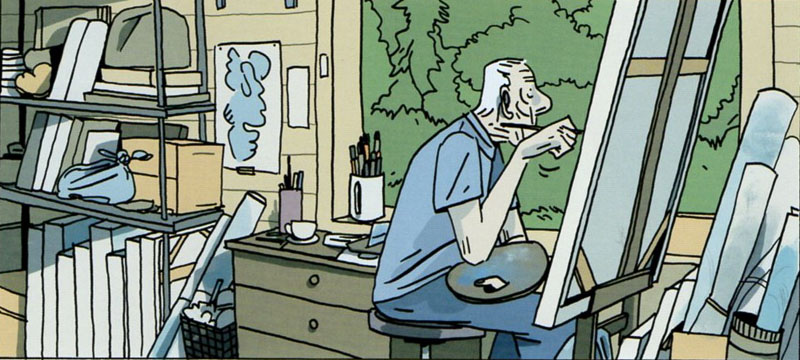 Parce qu’au tout début, on observe ce vieil homme à la mine flétrie vaquer à ses occupations dans son chalet, des rituels du quotidien que l’on sent réglés comme une horloge franc-comtoise. Après une nuit que l’on suppose sans sommeil, on le voit faire sa toilette, se raser, préparer son café, le boire, sans tartines, laver son bol, laver la soucoupe, les poser sur l’égouttoir. Puis d’un pas tranquille, Arthur traverse le jardin en direction de son atelier, son antre à lui, où s’entassent ses peintures et son matériel. On le regarde ouvrir les volets, allumer sa radio, déposer de la gouache sur sa palette, puis, enfin, reprendre religieusement sa toile abandonnée la veille, face au lac, une toile représentant une oie cendrée en train de prendre son envol… jusqu’à ce que…déboulant dans son champ de vision, un nageur vienne troubler la quiétude des lieux par son crawl énergique, provoquant l’envol d’une nuée d’oiseaux…