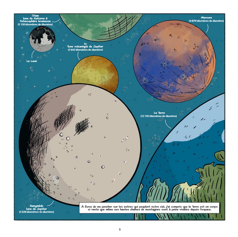 Les illustrations de Giulia Mammone restent tout à fait adaptées à ce type d’ouvrage. D’un côté, elle nous offre des vues d’artiste très plaisantes, parfois splendides, de l’univers avec ses soleils, ses galaxies et ses « pouponnières ». De l’autre, elle y intercale des scènes purement terrestres avec des objets du quotidien ou des personnages, dont celui probablement de Théo Drieu, le plus souvent pour métaphoriser des concepts plus abstraits ou présenter des intermèdes historiques dans le domaine scientifique. Assez quelconque sur ce plan, le trait reste très schématique et pas vraiment abouti, mais cela n’atténue guère l’enthousiasme que l’on pourra globalement ressentir avec cette lecture.