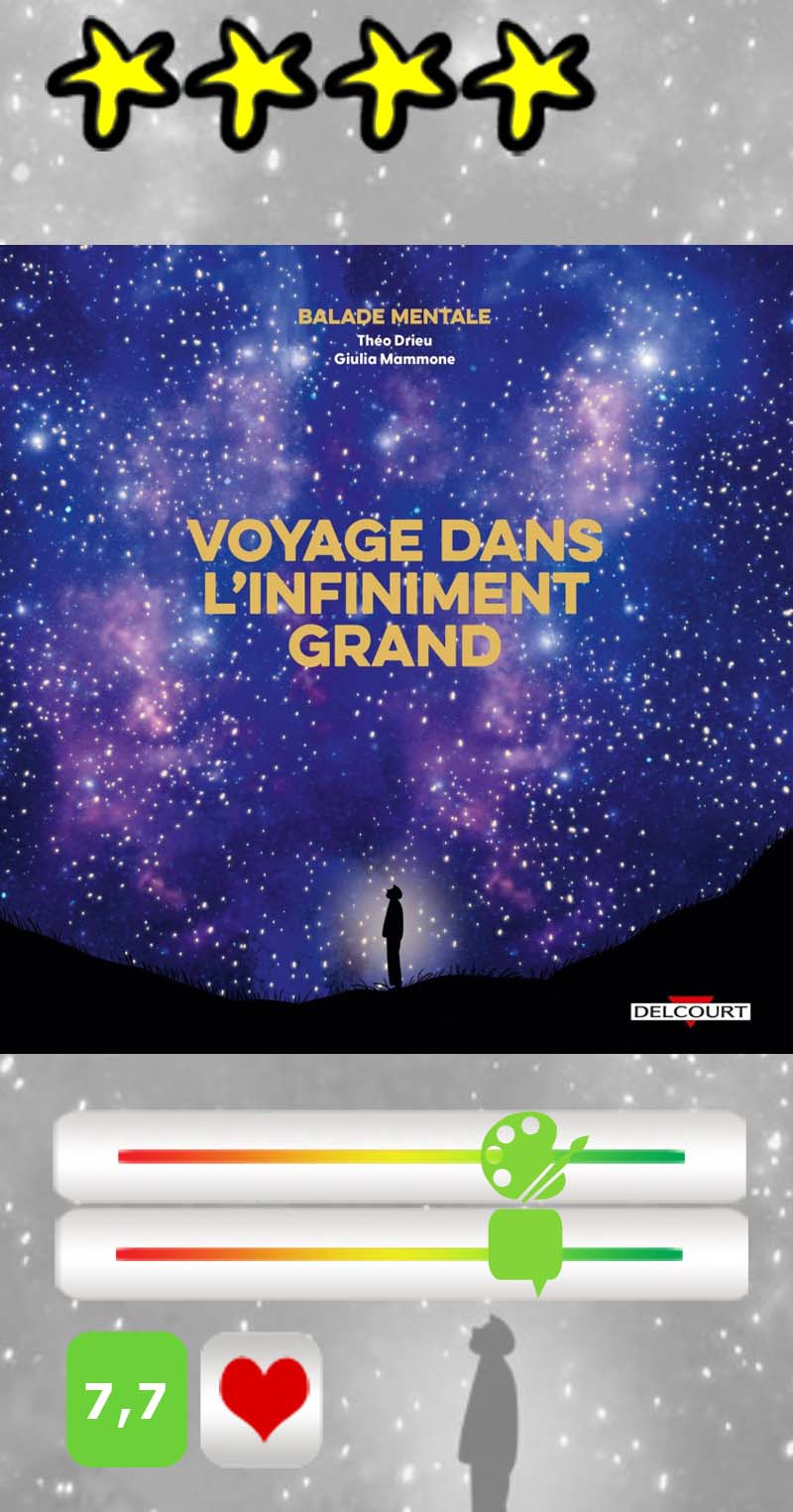 Pour peu que votre imagination soit suffisamment puissante, Voyage dans l’infiniment grand aura au moins ce mérite, pendant 160 pages, de vous faire prendre de la hauteur et d’admirer la voûte céleste, loin de notre monde terrestre parfois étriqué, et ce n’est déjà pas si mal. Comme le conclut l’auteur lui-même, « ces étendues démesurées peuvent être une expérience d’humilité, elles nous attendrissent en abimant un peu nos égos… » A bon entendeur !