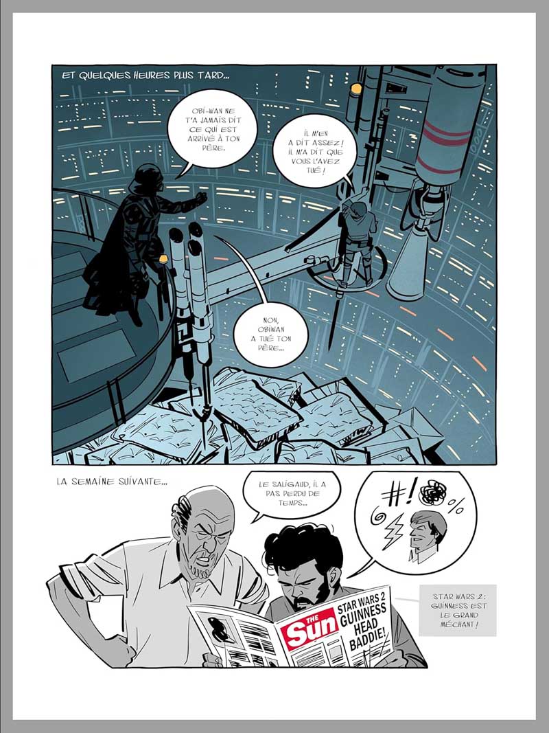 Tout en allant à l’essentiel, Laurent Hopman sait nous offrir moult anecdotes qui combleront les fans, passionnantes même dans leur insignifiance, souvent amusantes. On aura même droit à une séquence sur la genèse des Aventuriers de l’arche perdue, le film de Steven Spielberg coproduit par Lucas et sorti en salles quelques mois après L’Empire contre-attaque. Le tout est toujours très bien servi par le dessin nerveux et la mise en page hyper efficace de Renaud Roche. Avec toujours ce noir et blanc qui concède quelques touches à la couleur pour souligner des éléments-clés. Vous l’aurez compris, cet « épisode II » ne déçoit pas, tant s’en faut !