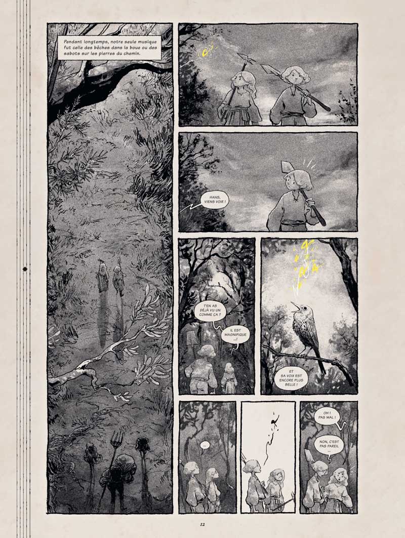 On rentre très facilement dans cette histoire, qui commence comme un conte noir et restera captivante jusqu’au bout. Le début fait immédiatement penser à Hansel et Gretel, ne serait-ce que par ce premier chapitre intitulé Hans et Helma, et commence dans un contexte très similaire. Les deux enfants vont entamer leur apprentissage de la vie de façon très cruelle, non seulement par leurs conditions de vie miséreuse dans cette campagne profonde, mais aussi avec la perte brutale de leurs parents massacrés par des bandits de grands chemins. Et dans cet océan d’obscurité, ils vont apprendre à nager, grâce en partie à leur sensibilité musicale que l’écoute des oiseaux dans la forêt proche va galvaniser. « Les oiseaux sont d’excellent maîtres de musique » : ainsi parlait leur oncle Ambel, lui dont le goût pour la musique fut tué dans l’œuf par la barbarie humaine…