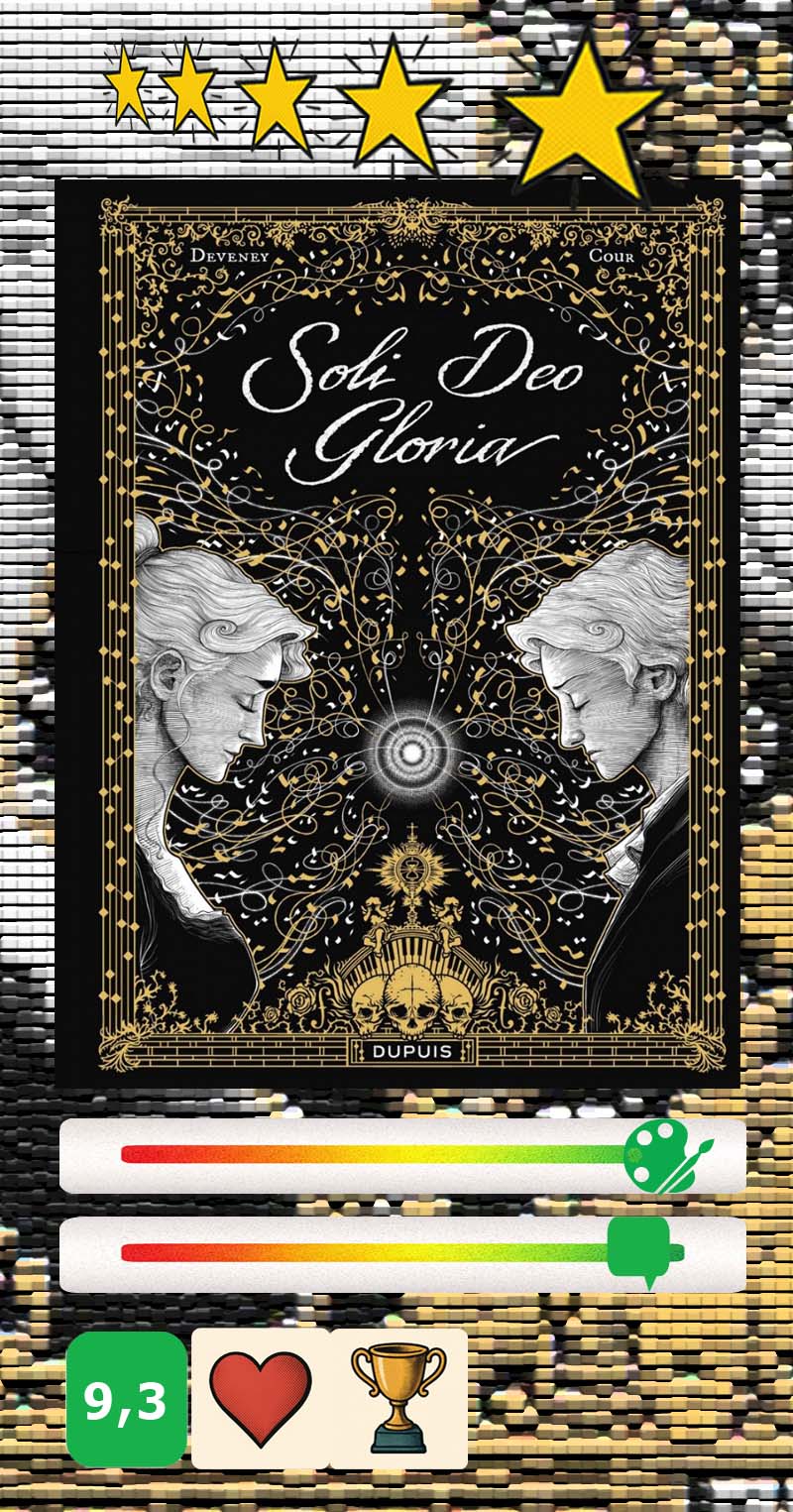 Mais que s’est-il passé entre ces deux auteurs, qui à l’unisson semblent avoir été touchés par la grâce ? Cette fresque tourbillonnante est un pur enchantement auquel je n’ai personnellement vu aucun bémol, aucune faille. C’est un conte de fées, noir d’encre, avec quelques rayons de soleil. Comme tous les contes de fées me direz-vous. Au-delà du récit initiatique, Soli Deo Gloria pourrait être accessoirement un antidote contre nos pulsions les plus primaires. Mais c’est sans doute d’abord un livre de sagesse célébrant la beauté des arts et de l’esprit, une symphonie graphique décrivant le combat entre l’ombre et la lumière, la laideur et la beauté, l’ordure et le sublime, dont on ne sait jamais vraiment qui l’emportera. Il dépeint un monde où, du fumier le plus dru émergent parfois des diamants. Et ce monde, bien que fictionnel, semble bien être le nôtre, pour le meilleur ou pour le pire. Oui, Soli Deo Gloria est un chef d’œuvre, et c’est ainsi que je poserai mon point final.