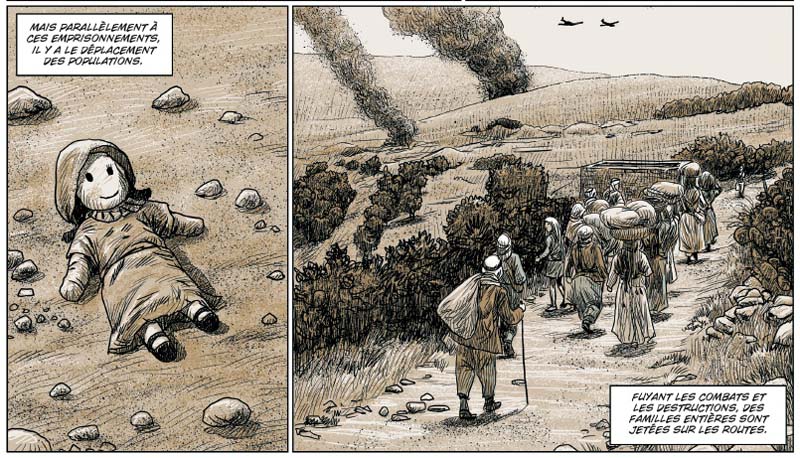 Très dense, la partie historique est ponctué par les « retex » du colonel Goya (que l’on suppose extrait de son livre) et des passages plus fictionnels, jouant davantage sur l’image, où l’on suit des gens ordinaires victimes d’un conflit qu’ils ne font que subir, toujours décidé dans les hautes sphères de part et d’autre.