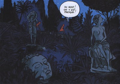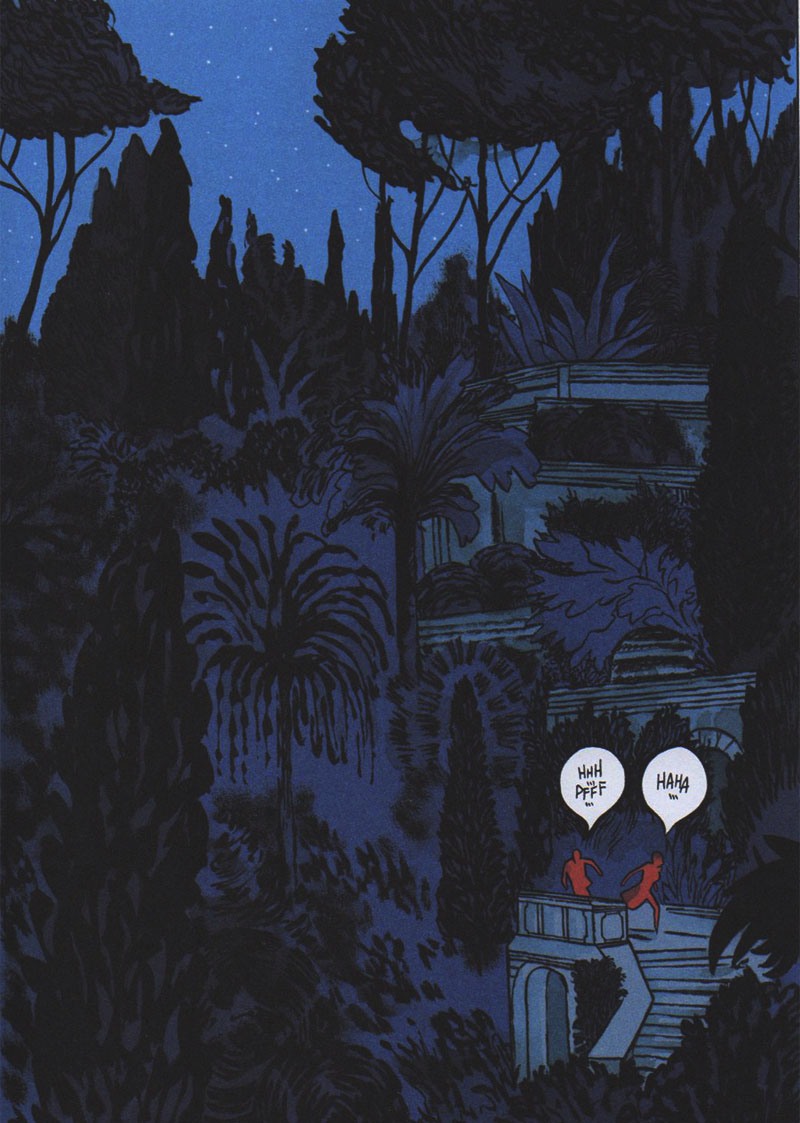 Alfred — C’est juste ! D’une part, le grand parc dans lequel se déroule une bonne partie de l’histoire, c’est presque le premier personnage qui m’est venu avant de trouver les autres qui viendraient vivre leur aventure à l’intérieur. C’était ma première envie de dessin, représenter un parc qui grandisse à mesure que l’histoire avance, dont on a du mal à bien cerner les contours et les limites, que ce soit presque un personnage vivant à part entière. Cela vient de plusieurs choses, notamment du fait que j’ai toujours aimé les parcs depuis l’enfance. J’ai plein de souvenirs qui sont liés à ça, beaucoup en Italie, dans différents endroits de l’Italie, beaucoup de souvenirs qui sont liés à des journées entières passées à me cacher dans les arbres ou à y traîner plus tard, plus grand. J’avais envie de raconter ça, c’était quelque chose qui me tenait à cœur. Ce parc est d’ailleurs composé de plusieurs souvenirs de jardins à différents endroits. L’Italie que je dessine dans ce livre est très théâtrale encore une fois. Par morceaux, tout existe mais j’en compose quelque chose qui est bien mon Italie sans être un endroit précis de l’Italie. Ça peut être un jardin du côté de Cinque Terre, le jardin botanique de Naples ou de Rome, ou encore des jardins cachés de Venise, des endroits dans lesquels j’ai vécu, dans lesquels j’ai eu à chaque fois une envie de conserver une petite partie de ces jardins.