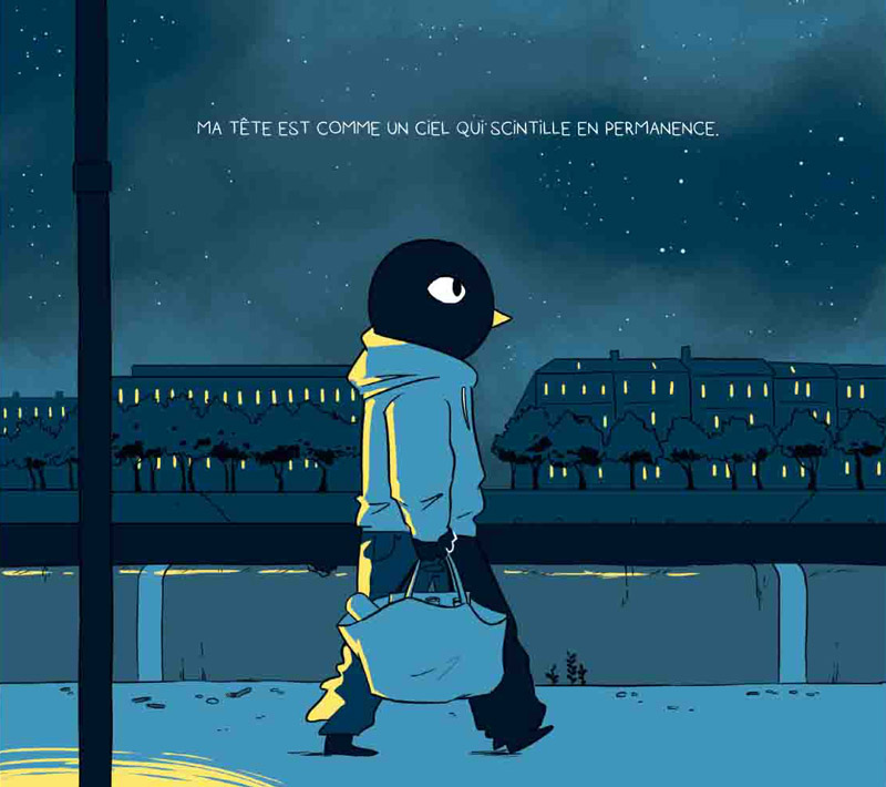 Lou Lubie : Ah oui, complètement ! Ah mais c’est lui, c’est vraiment lui. Il y a une part de fiction : son métier, ses amis, la rencontre avec Raya. Donc il y a beaucoup de fiction, mais l’essence, l’âme du personnage, c’est vraiment lui. Du coup il est, je pense, très touché d’être représenté, d’être mis en avant dans une bande dessinée, parce que ce n’est pas anodin. Et en même temps, il y a eu une grosse angoisse, qui rejoint les préoccupations du personnage, la crainte que les gens ne l’aiment pas. Qu’ils trouvent Birdo arrogant ou ne l’apprécient pas. Avant la sortie il était un peu inquiet. Comme dans la vraie vie en fait ! Je suis très contente parce que les gens aiment Birdo. Je lui ai dit : « Tu vois, quand les gens voient l’intérieur de toi, sans les couches de surface, ben en fait ils t’aiment. » C’est chouette, non ?