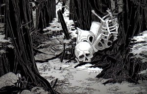 Gatignol : L’idée c’était que la forêt colle, qu’elle soit inextricable, et d’une certaine manière c’était la même logique que dans Petit. C’est-à-dire que pour Petit, j’avais imaginé l’album comme étant digéré par son environnement. Je voulais quelque chose de vivant comme s’il était dans un boyau permanent, dans une digestion continue. Là c’est un peu pareil, c’est comme si on était dans la bouche d’un monstre en fait, avec des lianes qui tombent… et là il s’agit d’une forêt de séquoias géants où normalement rien ne tombe…