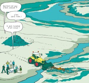 Inès Léraud — Là, je pense qu’on est plutôt dans une forme d’autocensure de la part de la maison d’édition, qui est prise dans le tissu économique breton et connaît parfaitement les conséquences de publications de ce type dans la mesure où elle reçoit des subventions du Conseil régional. Or dans Les Marées vertes, il était dit que le Conseil régional avait aussi une sorte de responsabilité dans la politique agricole bretonne. Et donc, en publiant un livre sur les marées vertes, elle risquait peut-être de mettre en balance ses subventions. Bon je dis ça, mais je n’ai pas enquêté sur les raisons de ce report… En tous les cas, pour nous par exemple, il y a une maison d’édition qui s’appelle Skol Vreiz, qui nous a contactés pour traduire notre livre en breton. On était d’accord, mais quelques semaines plus tard, ils nous ont dit : « Notre conseil d’administration s’est réuni, et il a estimé que comme on recevait des subventions du Conseil régional, on risquait de les perdre si on publiait une version bretonne de l’album. Donc on ne le fait pas ». Forme d’autocensure classique encore une fois.