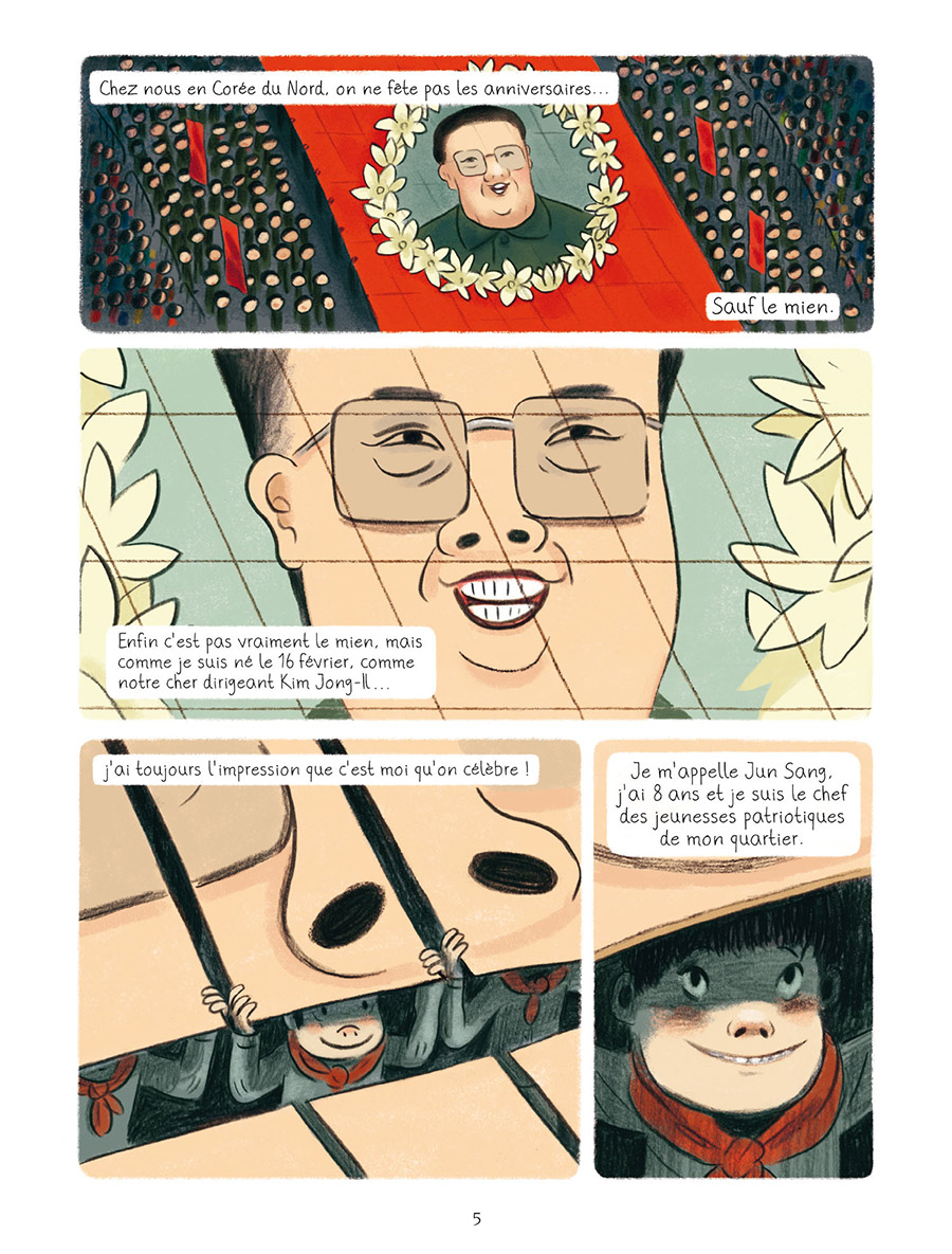 M.A. : L’histoire se déroule dans les années 80/90, sous Kim Jong-il, on suit donc la vie d’un petit nord coréen de ses 8 ans à ses 16 ans. Au début Jun Sang est le chef des jeunesses patriotiques de son quartier, il vénère Kim Jong-il et le soldat Weng, son héros de BD préféré (une sorte de Captain America sauce Nord Coréenne). Graphiquement, il fallait que le début du récit suivent les codes de l’imagerie de propagande, la couleur a donc ici un rôle dans la narration, puis au fil des épreuves que Jun Sang va rencontrer, elle va finir par disparaître complètement dans la seconde partie du récit sur le camp de travail. Sur ces derniers chapitres, le traitement graphique est un peu plus dur. On a vu Jun Sang grandir au fils des pages, jusqu’au dénouement ou on sort un peu la tête de l’eau, et la couleur revient.