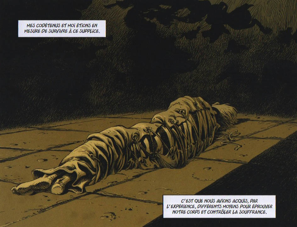 R.R. — Oui j’ai vraiment repris la description de London lorsqu’il dit : « Vous avez tous porté un jour une chaussure trop petite, trop serrée, qui ne vous va pas. Sur le coup, dans le magasin, on dit à sa maman que ça va, puis on fait dix pas, et ça commence à être insupportable. Imaginez ça sur le corps entier ! » D’autant plus que comme le personnage est une forte tête et que sa dignité consiste à résister et tenir tête aux matons, il les provoque en leur disant qu’il ne sent rien et leur demande de serrer plus… Donc ce qu’ils faisaient — et qui est expliqué aussi dans le livre —, c’est qu’ils écrasaient les personnes et leur vidaient l’air des poumons pour les serrer au plus près du corps, ce qui les empêchait de respirer. Les victimes étaient ainsi sous-alimentées en oxygène. Le cerveau, lorsqu’il n’a plus d’oxygène, il déraille. Dans cette histoire, on ne sait pas très bien s’il fait réellement tous ces voyages ou s’ils sont simplement dus à la torture à laquelle il est soumis… En même temps, ce n’est pas le sujet de London, mais ça laisse supposer que lors de ces séquences plus ou moins fantastiques surviennent peut-être des phénomènes purement physiques…