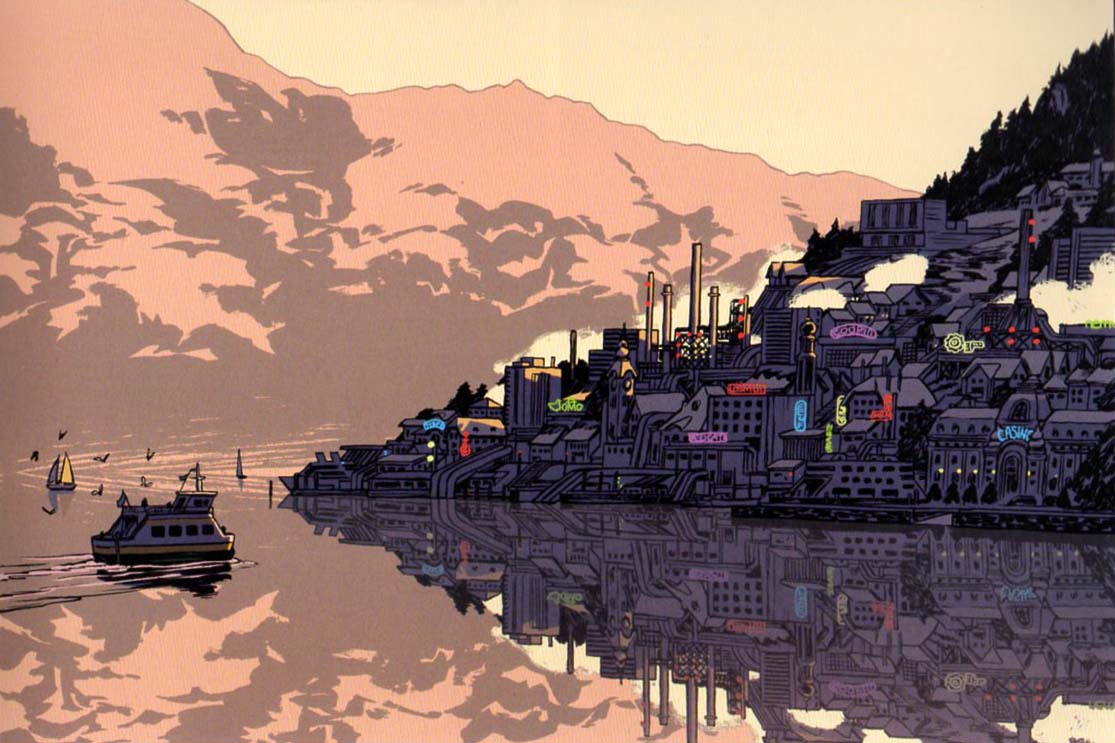 FP — Non, mais ce que je veux dire, c’est qu’il n’y a pas vraiment de Twin Peaks. C’est-à-dire qu’en fait, ça a été filmé dans des studios en Californie et qu’ils ont envoyé trois mecs filmer une cascade au Canada, trois autres filmer des sapins dans l’Oregon. C’est un endroit qui n’existe pas… C’est un précipité quoi… Au mois de décembre, je suis allé au festival de Bologne, j’ai pris le train, j’ai traversé la Suisse en passant par le Tessin, et quand j’ai longé le lac Majeur avant de descendre sur Milan, eh bien c’était Saint-Elme… avec des petits palmiers ! J’ai d’ailleurs retenu le nom d’un arrêt qu’on a fait dans une petite ville au bord du lac Majeur. Je suis allé « googler » et je me suis servi d’images pour le tome 2 de ce bled-là… ça aurait tout aussi bien pu être Évian…