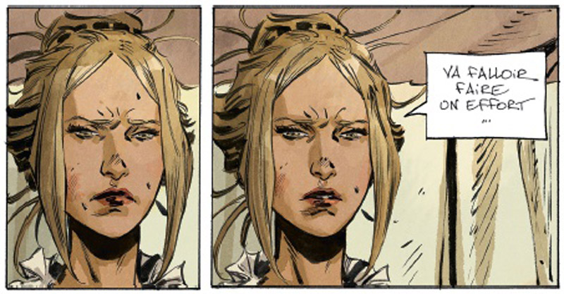 TM — Lucretia a une apparence un peu particulière et des réactions surprenantes, ce qui la rend vraiment intéressante. Par exemple au début du tome 2, je la trouve assez « cliché » dans ses réactions. Tu sens que le monde duquel elle vient s’exprime encore, et puis tout ça s’effondre par la suite. Morphologiquement, elle a une bouche légèrement avancée, un petit nez retroussé, et une tête particulière, tout en étant assez jolie. Je pars toujours du principe de donner du vécu aux visages… Quant à les faire jouer… je suis complètement impliqué dans mon travail, sans aucune distance. Je vis l’histoire en dessinant. C’est comme si un film se déroulait devant moi, et je capture les expressions. Je ne cherche jamais l’expressivité extrême. Certains choisissent le point culminant d’une expression pour la dessiner, mais moi, j’aime les demi-expressions, comme ces photos prises au mauvais moment avec les yeux à moitié fermés. J’essaie de faire en sorte que mes personnages jouent juste, mais la difficulté réside dans le fait qu’ils ont tendance à jouer d’une façon qui est la mienne. C’est un exercice presque schizophrénique de leur donner une incarnation différente.